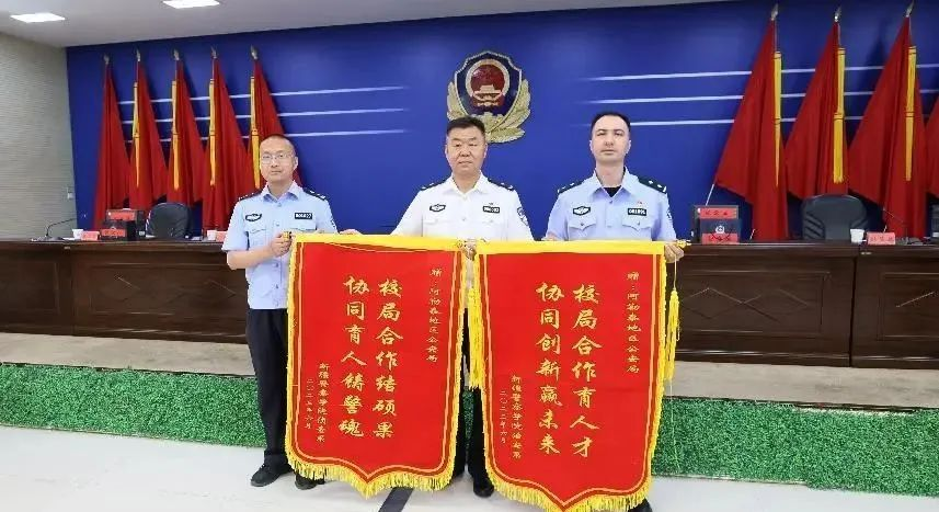 阿勒泰地区公安局政治部副主任赵冀梅宣读《阿勒泰地区公安机关关于表彰孔凡涛等15名优秀实习学警决定》并为获得荣誉的学警颁发荣誉证书。实习带队指导教师代表学院向阿勒泰地区公安局赠锦旗。