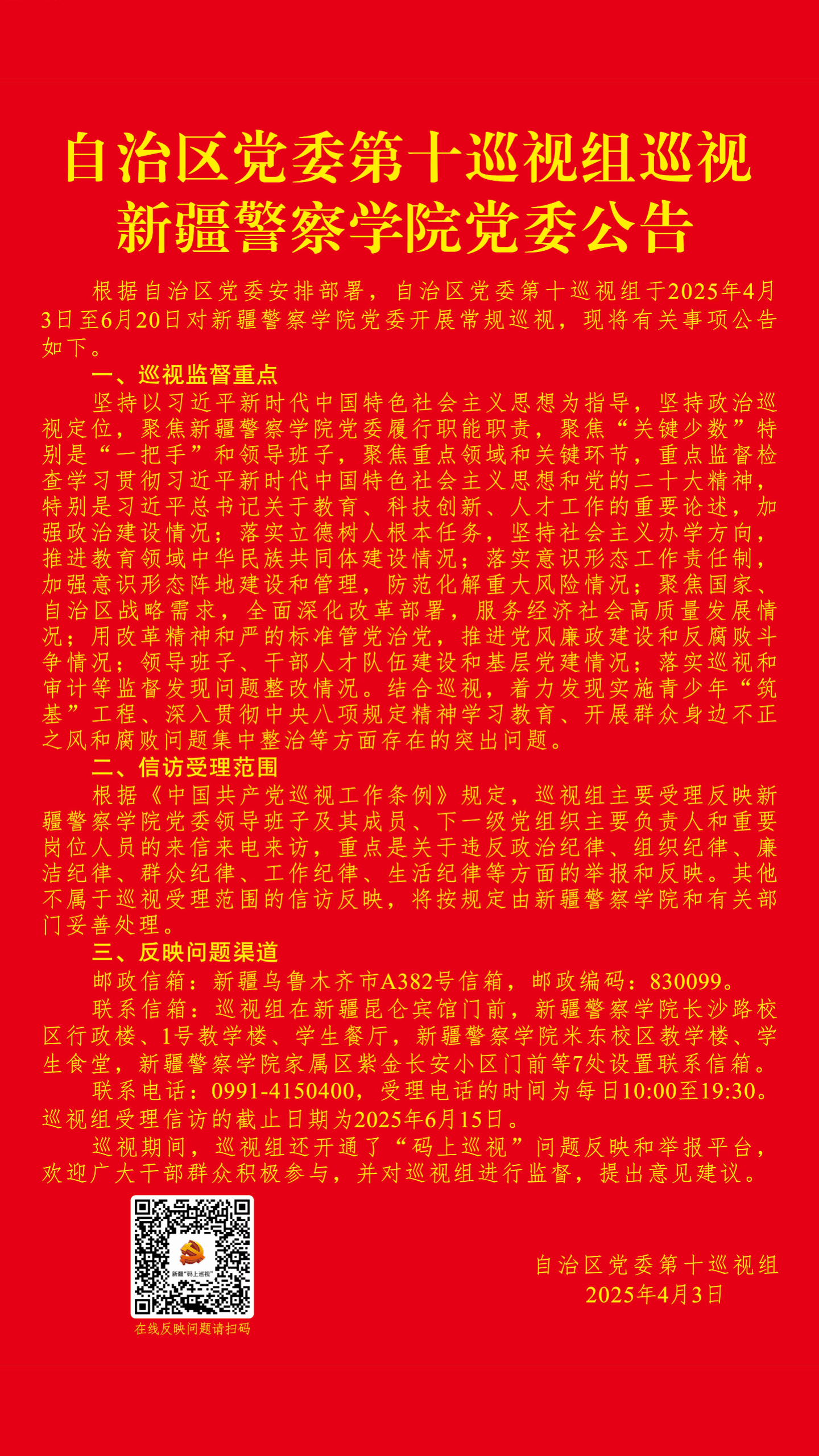 自治区党委第十巡视组巡视新疆警察学院党委公告