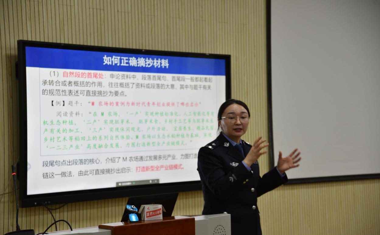 基础教研部教师贾娜尔以“认识公考”为题,从公安联考的出题者、答题者和阅卷者的思维模式,引导学警们形成系统性备考思维,通过重点解读《申论》考察的具体能力、本质要求、规律和作答技巧等问题,结合实际案例为学警们讲授解题技巧和答题策略。