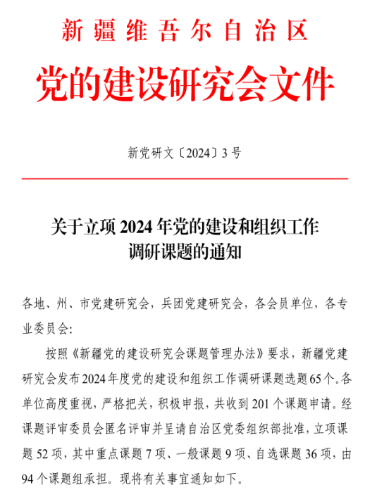 按照《新疆党的建设研究会课题管理办法》要求,经课新疆党建研究题评审委员会匿名评审并呈请自治区党委组织部批准,由马克思主义学院戚良钊老师申报的《推动组织体系和工作力量直达基层路径研究》、法律系阿合买提·亚库甫老师申报的《引导激励党员在网络空间中发挥先锋模范作用研究》获准立项。