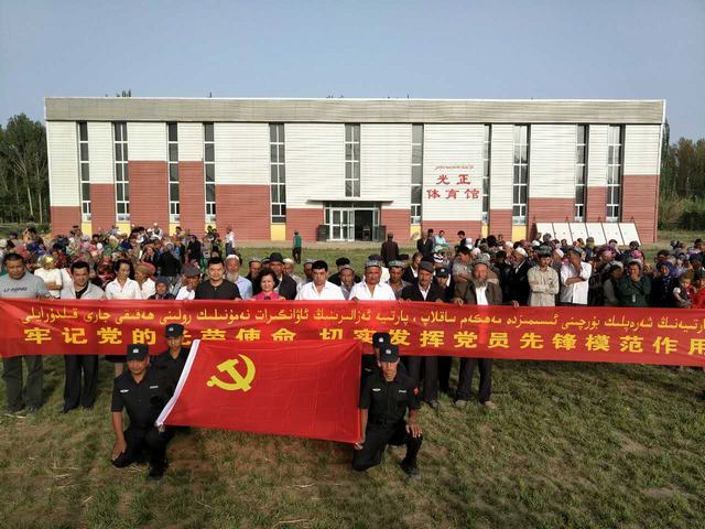 为庆祝建党95周年,认真贯彻落实麦盖提县委、希依提墩乡党委有关文件要求,在全体党员中认真开展“两学一做”学习教育,进一步提高新疆警察学院住琼库尔买里村工作组临时党支部和全村党员干部的党性修养, 6月27日,新疆警察学院住琼库尔买里村工作组临时党支部与琼库尔买里村党支部在光正体育馆门前联合开展“重温入党志愿、重温入党誓词”主题活动,新疆警察学院党委委员、纪检委书记、住村工作组总领队、琼库尔买里村工作组组长帕提曼·吐尔逊带领工作组临时党支部全体党员和琼库尔买里村党支部全体党员参加此次活动,全村群众观摩活动。