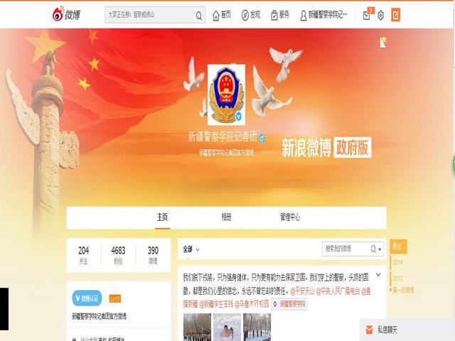 12月27日,学院记者团官方微博@新疆警察学院记者团发出一条“我们脱下戎装,只为强身健体,只为更有能力去保家卫国。我们穿上的警服,头顶的国徽,都是我们心里的信念,永远不曾忘却的责任”的微博,引起了广大媒体和公安系统官方微博的转发和评论。截止12月28日,原创微博浏览量突破二十万人次,公安部、亚心网、新快报、大江晚报、上百家公安部门官方微博转发了此微博。