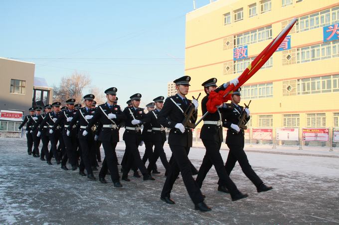 早晨10:30,伴随着冬日的旭日,学院升旗仪式正式开始,全院师生身着警服庄严肃立,威武雄壮的国旗护卫队员们护送鲜艳的五星红旗进场,高昂激越的中华人民共和国国歌在校园上空激荡,朝阳挥洒在徐徐上升的五星红旗上,象征着我们的祖国如初升的太阳充满了希望。