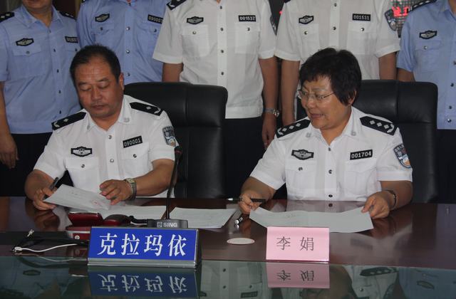 2014年8月15日下午,学院与克拉玛依市公安局“校局合作”框架协议签字及新疆警察学院教学实践基地挂牌仪式在克拉玛依市公安局指挥大厅隆重举行。学院党委副书记、院长李娟,教务处处长曹修伟,公安管理系主任王程辉,治安系主任孙常平;克拉玛依市公安局党委书记、局长曾宪江,副局长李剑、张振俊,政治处主任吕召龙等领导同志以及学院相关系部教研室负责人、克拉玛依市公安局国保、治安、刑侦、交警、信通等业务部门负责人共计20余人参加了仪式。签字及挂牌仪式之前,“校局”双方还就公安实际需求的人才标准、信息化条件下公安工作发展的新趋势、新特点,以及公安教育和培训工作如何贴近、适应公安专业工作需要,努力加强针对性等双方关注关心的问题进行了深入的交流和热烈的讨论,达成了众多的共识。应曾宪江局长邀请,李娟院长一行还分别参观了克拉玛依市公安局指挥中心、刑事科学技术实验室、克拉玛依市公安局石莫治安派出所。