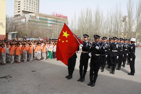 为加强中小学生爱国主义教育,唱响“热爱伟大祖国,建设美好家园”主旋律,我校受乌鲁木齐高新区(新市区)团委邀请,安排国旗护卫队21名队员于4月18日前往乌鲁木齐市第三十五小学、第五十一中学举行升旗仪式。在升旗现场,我校国旗护卫队学员警容严谨、精神焕发的良好精神面貌给在场师生留下了深刻的印象,得到了师生们的一致好评。