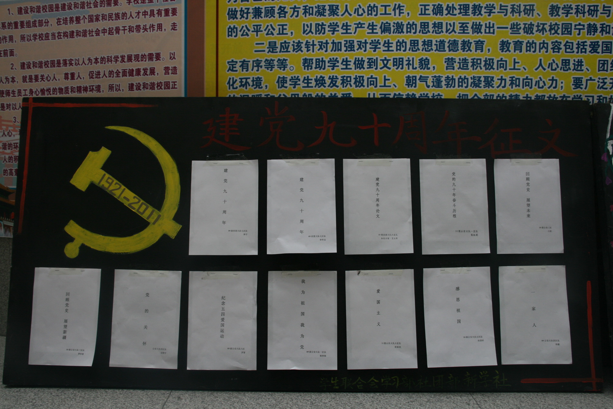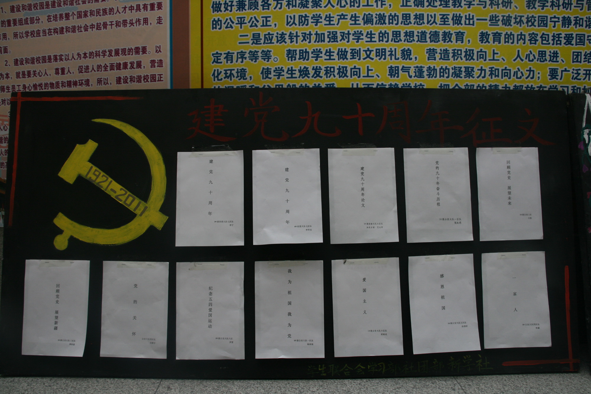 为纪念党的九十华诞,讴歌建党以来新疆所取得的伟大成就,激发我校学员爱党爱国爱校的热情。2011年4月19日学生处团委举办的主题为“回眸党的光辉历程讴歌新疆发展成就”纪念建党90周年征文大赛。各大队学员积极踊跃参加,共收集作品三百余件。