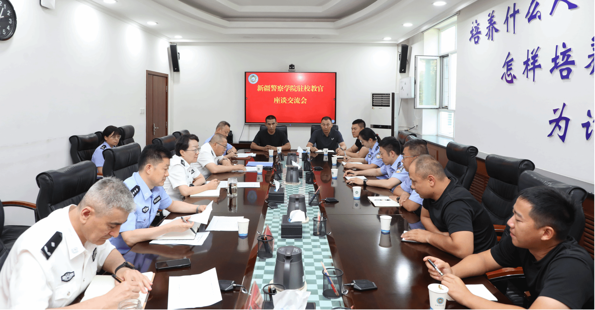 座谈会上,驻校教官们对自治区公安厅政治部和学院的关心关怀表示感谢;结合本学期工作实际,总结了在岗位实践中的收获与体会;围绕教育教学、人才培养等方面工作提出了意见建议。