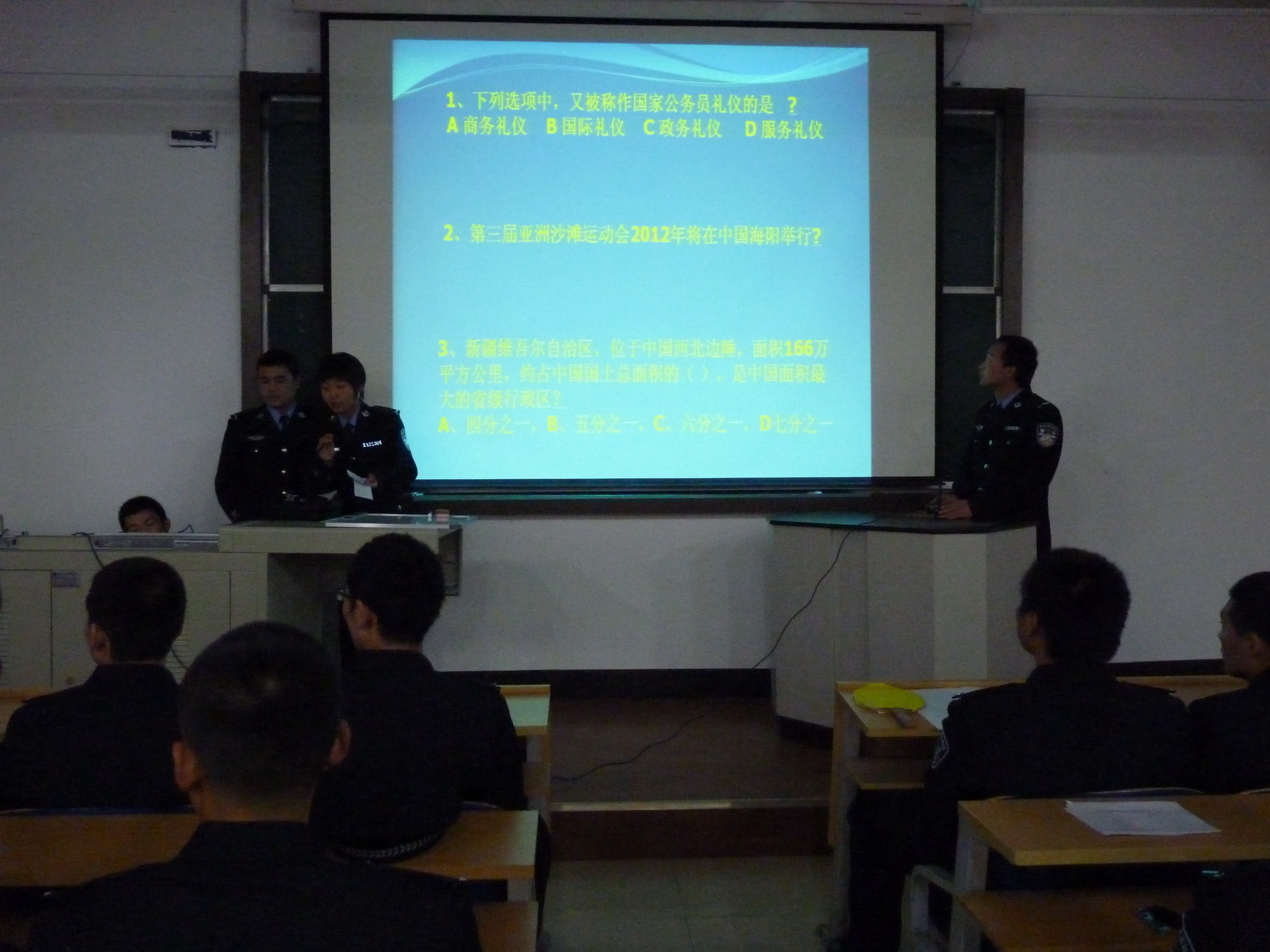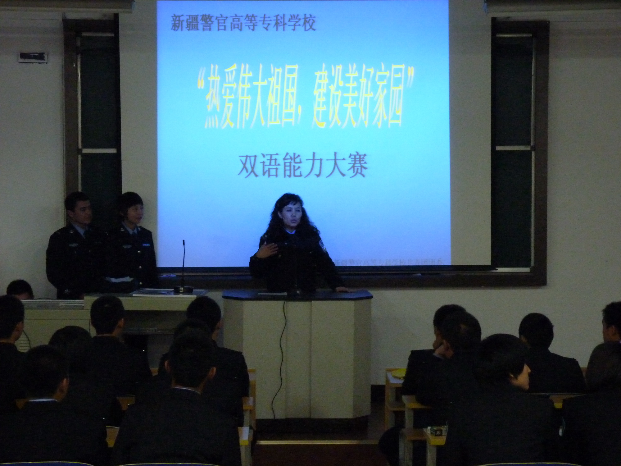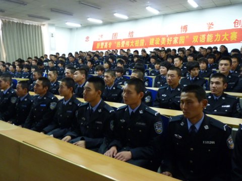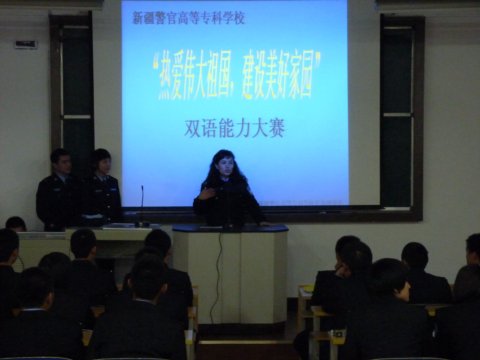 为认真贯彻新疆工作座谈会精神和自治区教育厅文件的相关内容,充分调动全校学员学习双语的积极性,进一步巩固我校民族团结成果,校团委于11月24日下午举办了“热爱伟大祖国 建设美好家园”系列活动之二—双语能力大赛。语言系祖丽菲亚老师、孜来杰木老师、茶古丽老师,10级侦查大队教导员艾尼瓦尔、09级侦查大队副大队长肖克来提、团委老师杨琳静、担任了本次大赛的评委。
