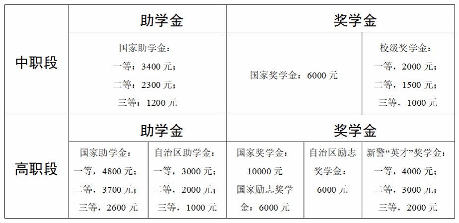 新疆警察学院米东校区建有完善的学生资助体系(如有变化根照国家、自治区、学院政策为准),全力保障家庭经济困难学生顺利完成学业。