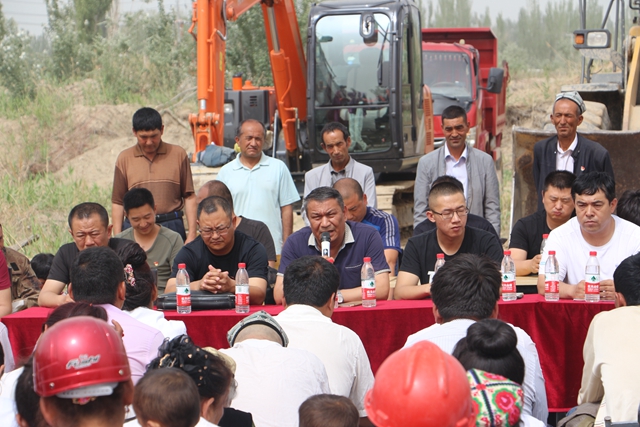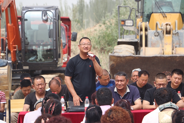 开工典礼一开始,新疆警察学院驻琼库尔买里村工作队队长地里木拉提·斯依提发表讲话。首先,祝贺我村的“繁荣”林果业合作社顺利开工。同时也向为成立合作社付出辛劳和支持的各级领导表示衷心的感谢。琼库尔买里村的“繁荣”林果业从计划雏形时期到正式开工动土,都得到了乡领导的大力支持和资金扶持。其次,工作队队长地里木拉提·斯依提向在座的各位表态,作为琼库尔买里村党工委书记,一定不会辜负各级领导及父老乡亲的期望,管理好合作社,尽最大的努力实现农民增收、改善农村生态环境。尽管这个林果业合作社的土质不太好,但相信在大家的共同努力下,一定会取得成效。